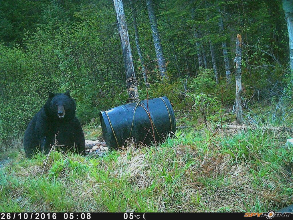 Lors du printemps 2022, croyez-le ou non mais j’ai vu et même filmé cet ours en situation de chasse sans même essayer de le récolter. Ce soir-là j’étais avec un ami et je lui avais laissé l’opportunité de récolter le premier ours de notre week-end pour son anniversaire. Lorsque nous avons entendu un ours faire du bruit en progressant vers les appâts comme le font les sujets matures, mon ami m’a demandé s’il pouvait photographier son ours avant de tirer. J’ai acquiescé à sa demande et je me suis mis derrière la caméra! Finalement l’ours n’est pas sorti complètement à découvert et il est passé derrière un de mes barils dont le dessus est à 48 pouces du sol. Il faut comprendre qu’un ours d’une hauteur de 36 pouces est un ours trophée qui avoisine les 300 livres. Il était cependant très facile d’effectuer un tir mortel sur l’animal. Alors imaginez ma réaction lorsque j’ai réalisé que l’ours que j’étais en train de filmer alors que mon chasseur avait son appareil photo en main au lieu de sa carabine frôlait en fait les 48 pouces de hauteur! Du jamais vu pour moi en plus de 20 ans de chasse! Je l’ai observé jusqu’à ce qu’il disparaisse et c’est la dernière fois que je l’ai vu en vrai, en photo ou en vidéo!