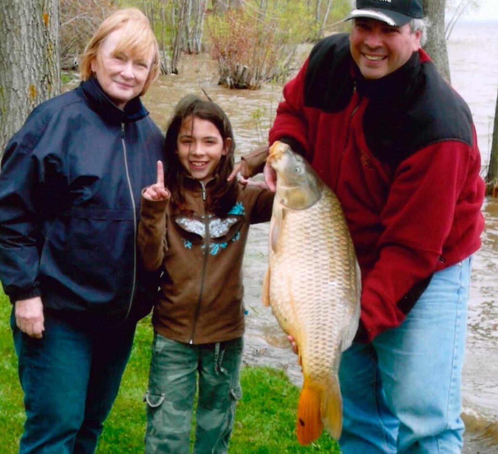A-La fille de l’auteur, Anaïs, avec sa carpe d’un poids de 28 lb. B- L’auteur à droite, sa mère à gauche et sa fille Emma au centre avec sa carpe de 32 lb.